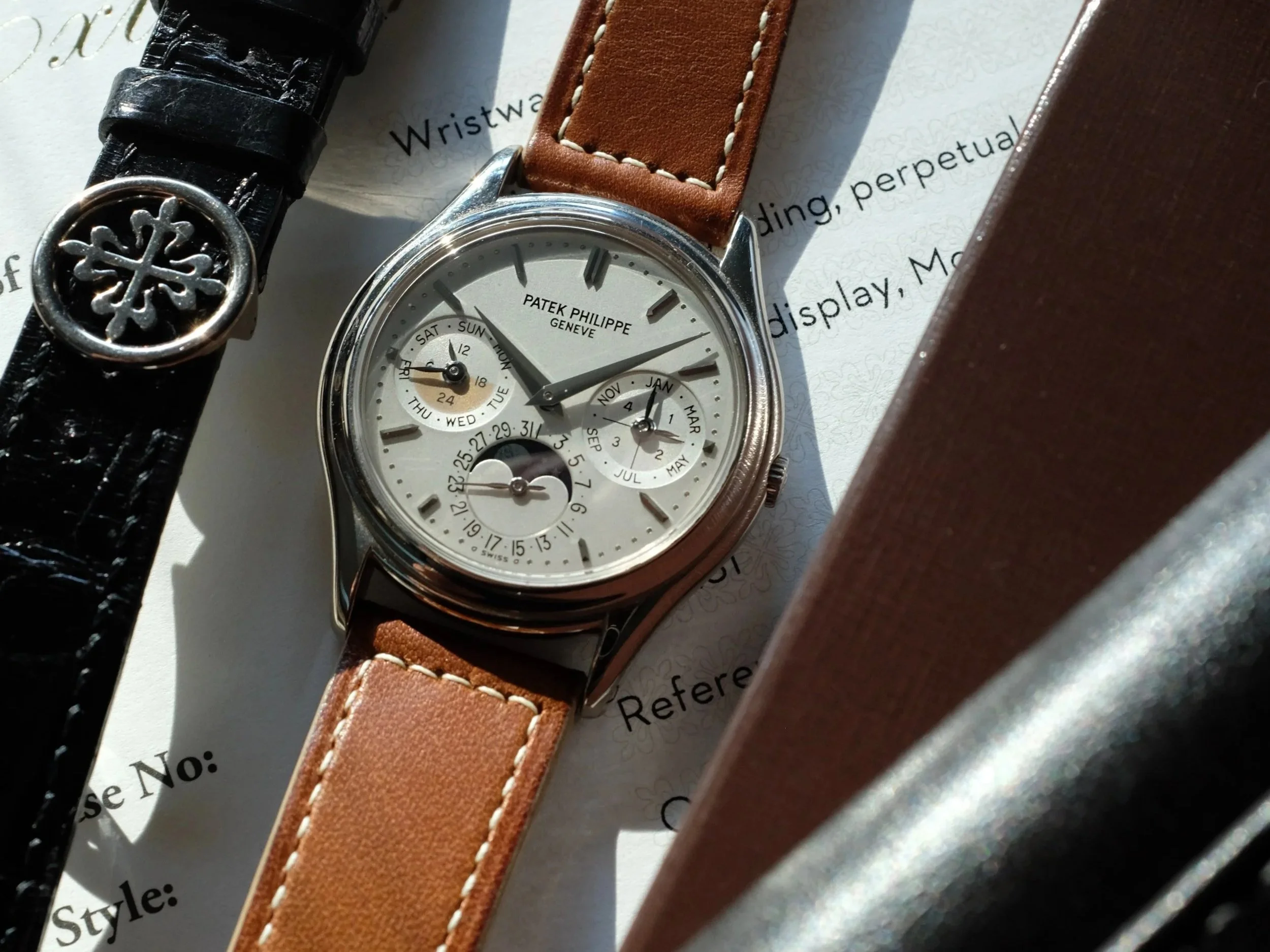 Bracelet/Strap: Brown box stitched calfskin w/ WG Patek tang buckle + black Patek alligator strap with original deployant clasp